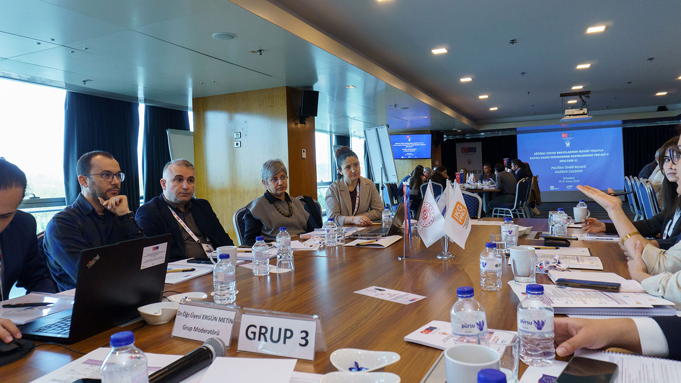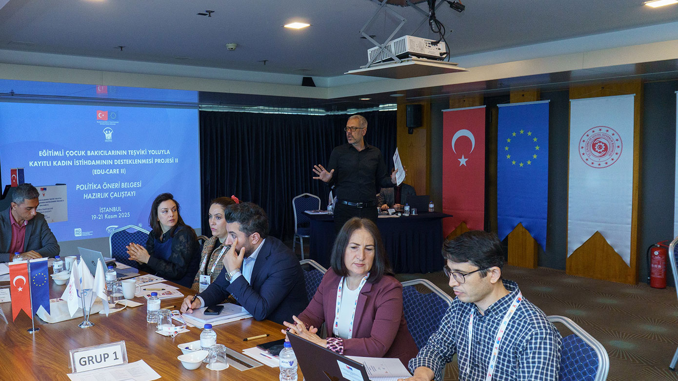 Eğitimli Çocuk Bakıcılarının Teşviki Yoluyla Kayıtlı Kadın İstihdamının Desteklenmesi Projesi II (EDU-CARE II) kapsamında Politika Öneri Belgesi Hazırlık Çalıştayı 19-21 Kasım 2025 tarihinde 54 kişinin katılımıyla İstanbul’da düzenlendi. Çalıştay organizasyonuna, Cumhurbaşkanlığı Strateji ve Bütçe Başkanlığı, Çalışma ve Sosyal Güvenlik Bakanlığı, Milli Eğitim Bakanlığı, Aile ve Sosyal Hizmetler Bakanlığı, İŞKUR, Gelir İdaresi Başkanlığı, Uluslararası Çalışma Örgütü (ILO), Birleşmiş Milletler Kalkınma Programı (UNDP), Avrupa Birliği Delegasyonu ve üniversitelerden ilgili akademisyenlerin katılımı ile gerçekleştirilmiştir.